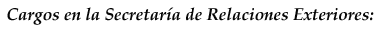 En México: Jefe del Departamento de Naciones Unidas. Subdirector General de Organismos Internacionales. Director General de Relaciones Culturales. Director en Jefe para Asuntos Culturales y Cooperación Técnica Internacional.